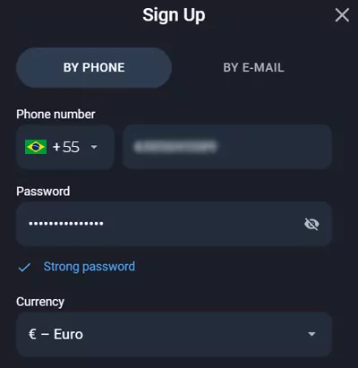 Ao abrir o formulário de registro, as informações solicitadas são: telefone, e-mail, moeda e a criação de uma senha;